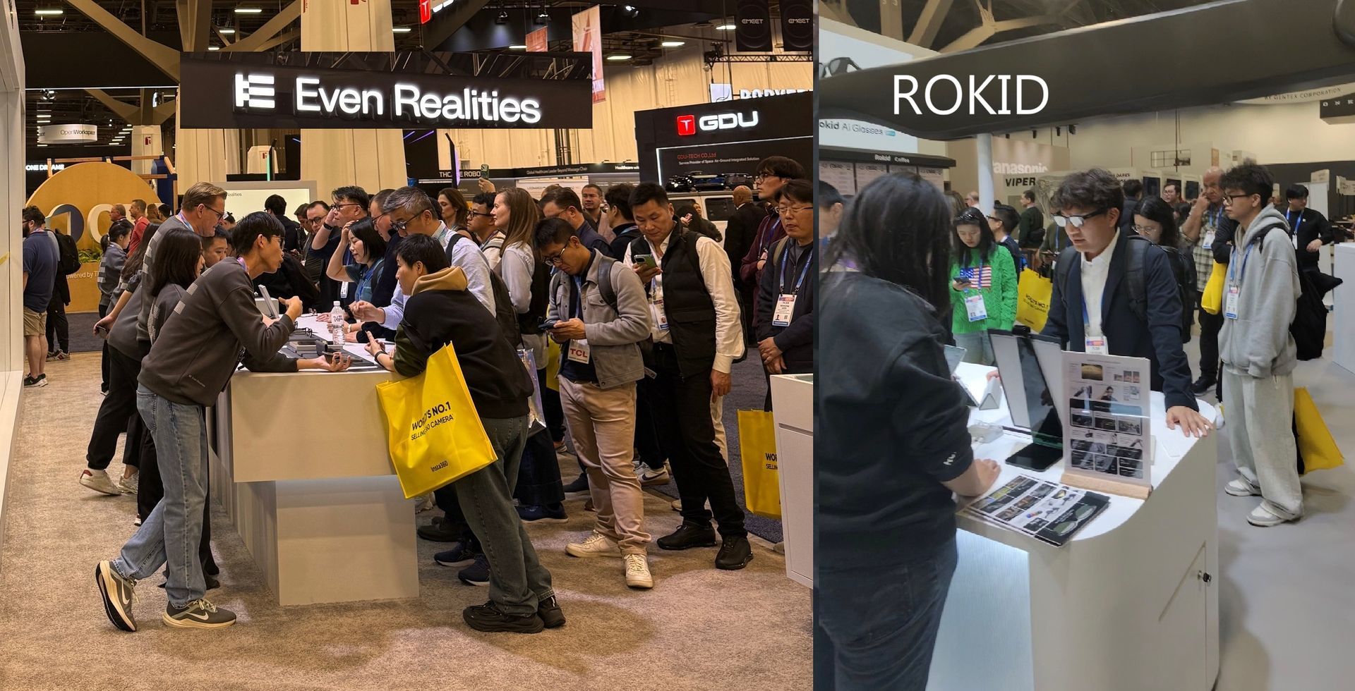 スマートホンに続いてスマートウォッチ、スマートリング、そしてスマートグラスにVRグラスが出てきましたが、次なるガジェットはガラス面に表示が出せるARグラスです。ご覧ください、CESでの待ち行列、待ち行列。